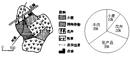 | 某农场的土地利用(左图)和年收入构成(右图) |
