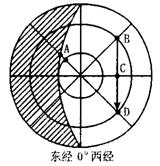 如右图所示,当地球上昼半球与东半球重合时,回答1~2题: